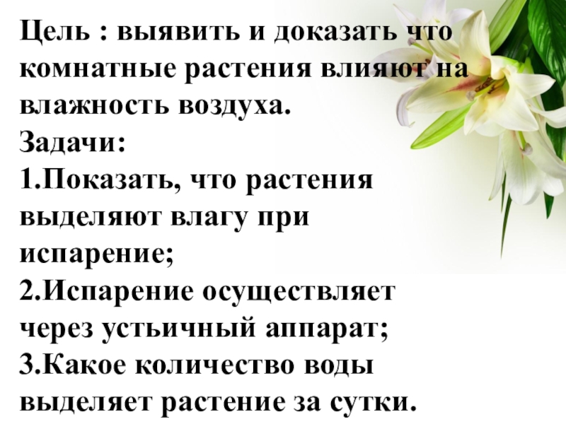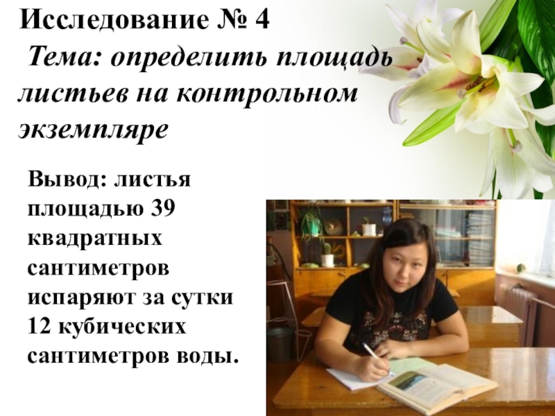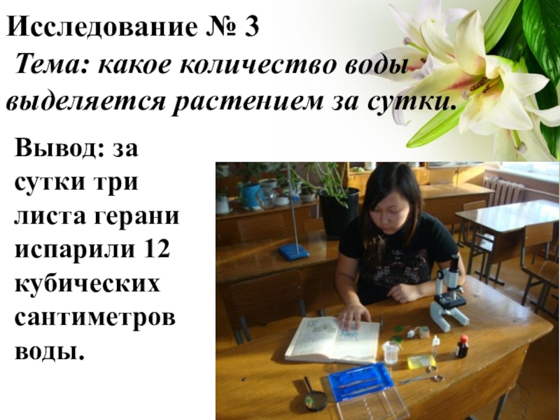 Вывод: за сутки три листа герани испарили 12 кубических сантиметров воды.