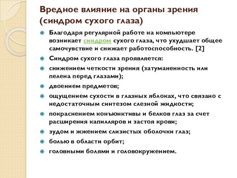 Слайд 5Вредное влияние на органы зрения(синдром сухого глаза)