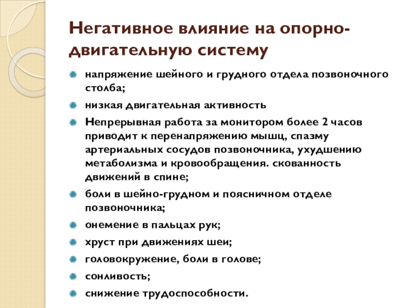 Слайд 6Негативное влияние на опорно-двигательную систему
