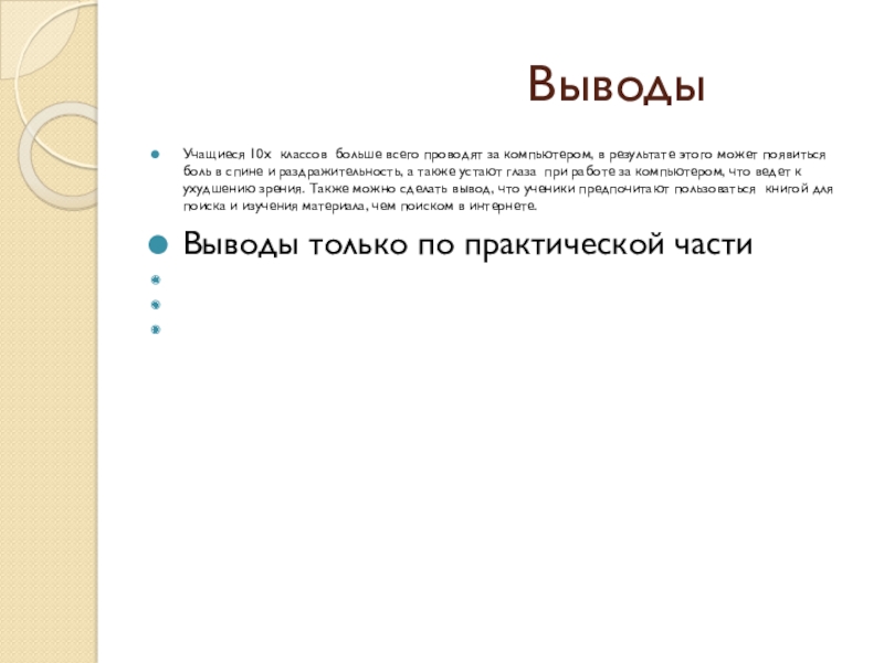 Учащиеся 10х классов больше всего проводят за компьютером, в результате этого может появиться боль в спине и раздражительность, а также устают глаза при работе за компьютером, что ведет к ухудшению зрения. Также можно сделать вывод, что ученики предпочитают пользоваться книгой для поиска и изучения материала, чем поиском в интернете.