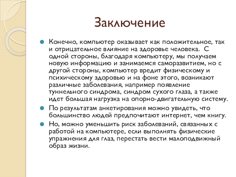 положительное, так и отрицательное влияние на здоровье человека. С одной стороны, благодаря компьютеру, мы получаем новую информацию и занимаемся саморазвитием, но с другой стороны, компьютер вредит физическому и психическому здоровью и на фоне этого, возникают различные заболевания, например появление туннельного синдрома, синдром сухого глаза, а также идет большая нагрузка на опорно-двигательную систему.