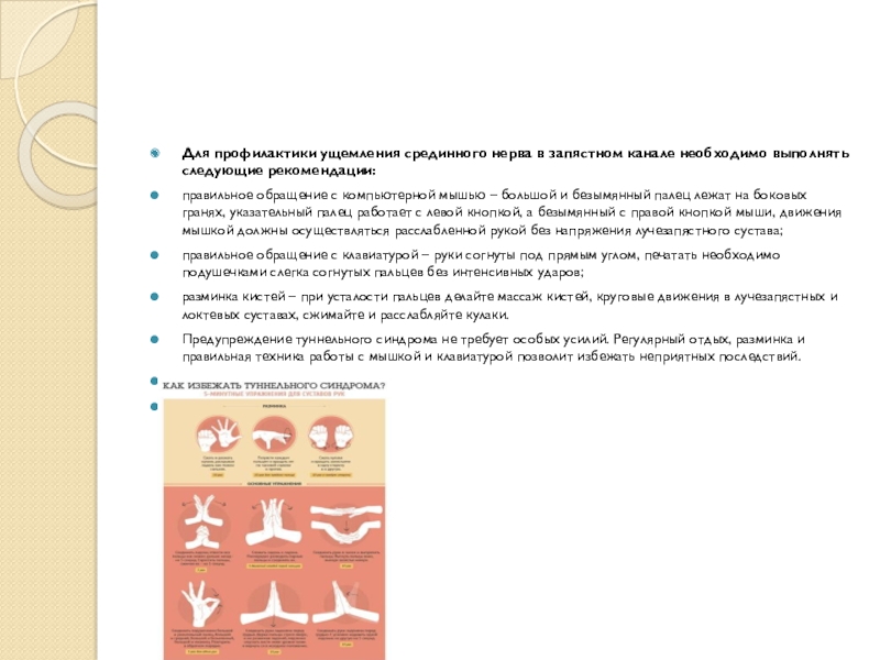 Слайд 16Для профилактики ущемления срединного нерва в запястном канале необходимо выполнять следующие