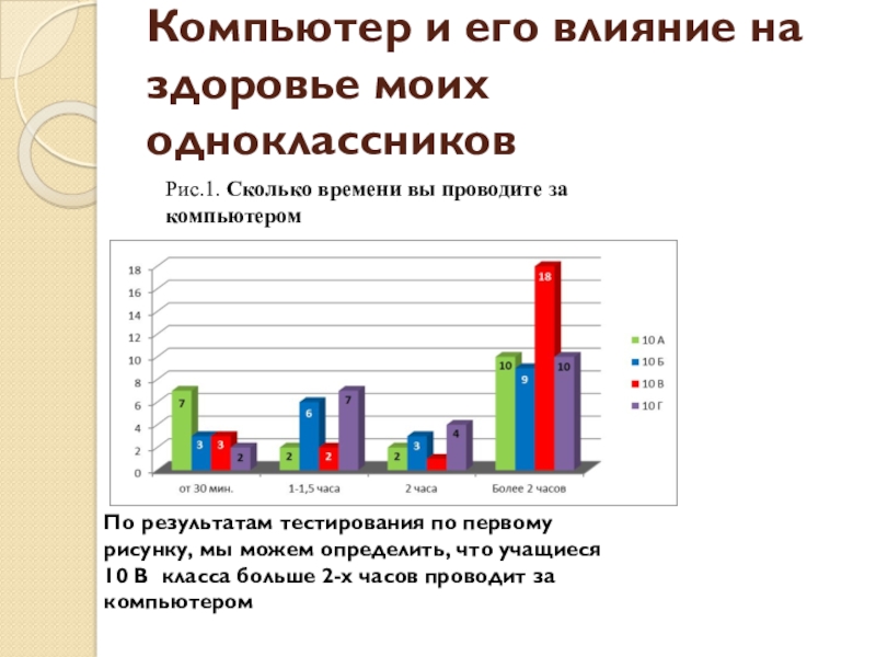 По результатам тестирования по первому рисунку, мы можем определить, что учащиеся 10 В класса больше 2-х часов проводит за компьютером