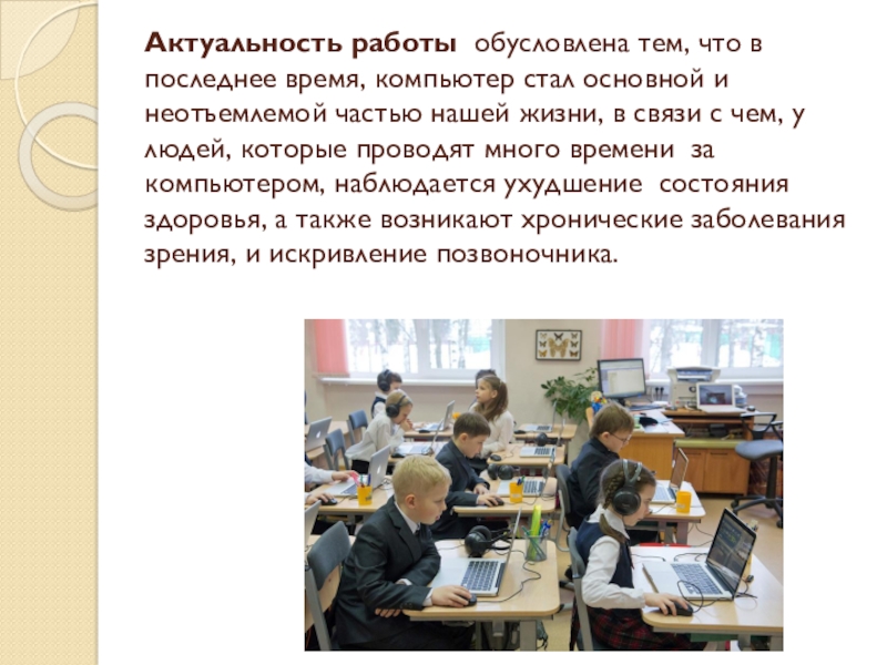 Слайд 2Актуальность работы обусловлена тем, что в последнее время, компьютер стал основной