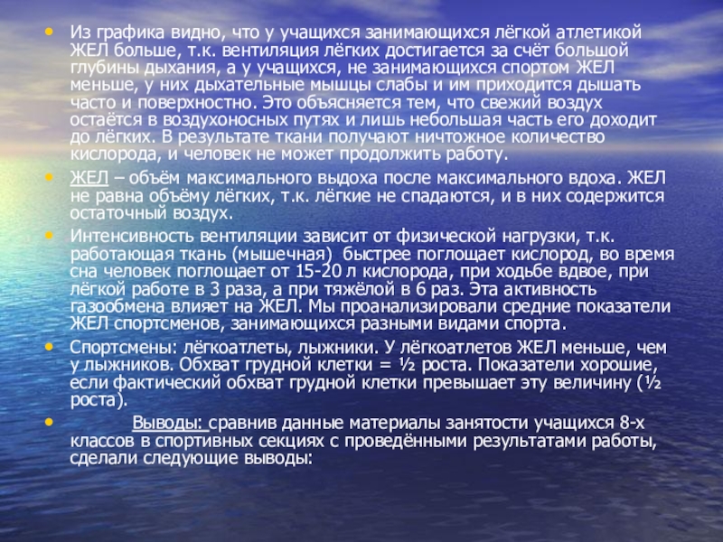 т.к. вентиляция лёгких достигается за счёт большой глубины дыхания, а у учащихся, не занимающихся спортом ЖЕЛ меньше, у них дыхательные мышцы слабы и им приходится дышать часто и поверхностно. Это объясняется тем, что свежий воздух остаётся в воздухоносных путях и лишь небольшая часть его доходит до лёгких. В результате ткани получают ничтожное количество кислорода, и человек не может продолжить работу.