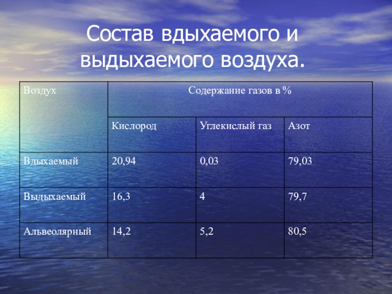 Слайд 4Состав вдыхаемого и выдыхаемого воздуха.