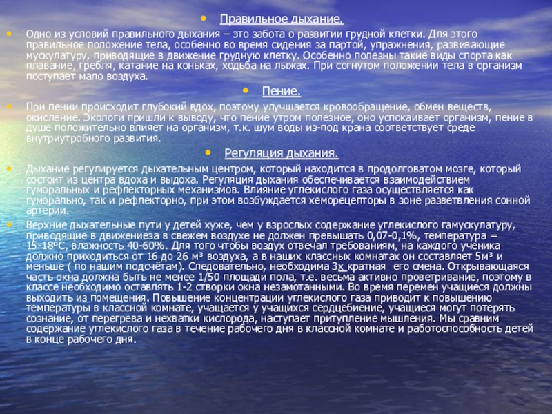 грудной клетки. Для этого правильное положение тела, особенно во время сидения за партой, упражнения, развивающие мускулатуру, приводящие в движение грудную клетку. Особенно полезны такие виды спорта как плавание, гребля, катание на коньках, ходьба на лыжах. При согнутом положении тела в организм поступает мало воздуха.