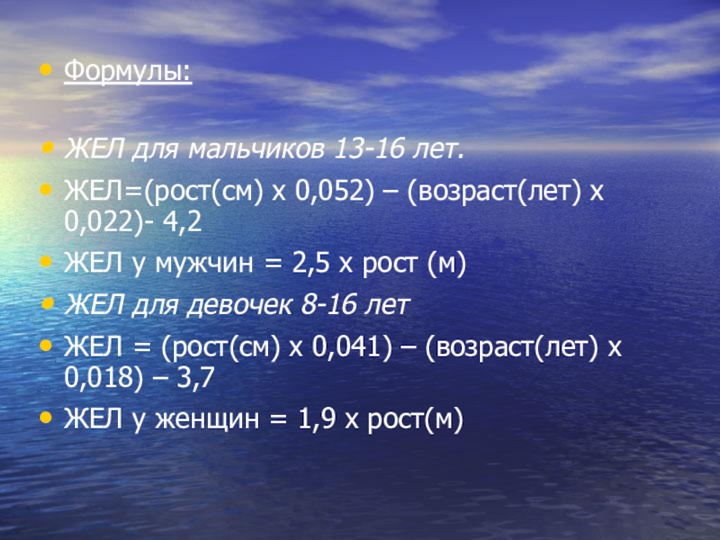 ЖЕЛ = (рост(см) х 0,041) – (возраст(лет) х 0,018) – 3,7