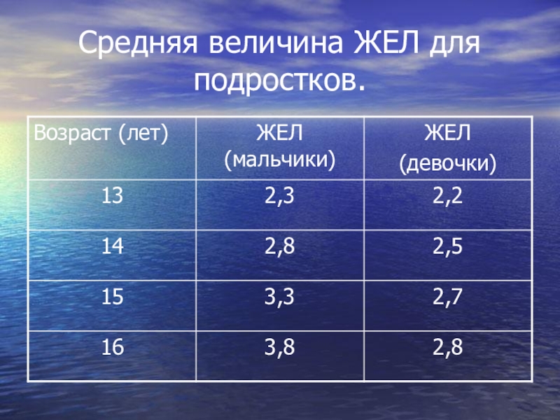 Слайд 6Средняя величина ЖЕЛ для подростков.