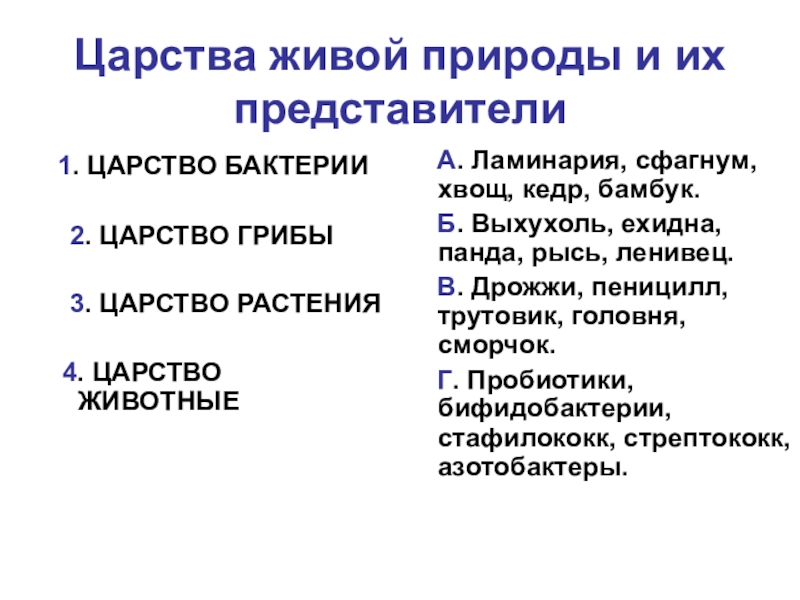 Г. Пробиотики, бифидобактерии, стафилококк, стрептококк, азотобактеры.