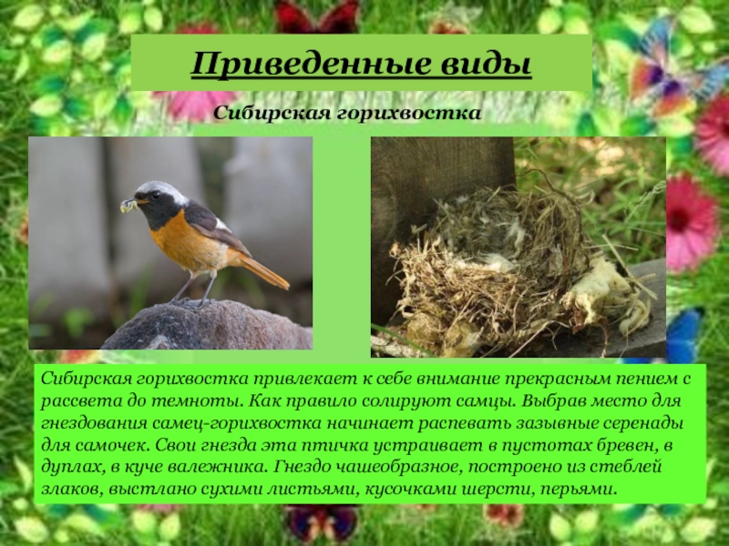 рассвета до темноты. Как правило солируют самцы. Выбрав место для гнездования самец-горихвостка начинает распевать зазывные серенады для самочек. Свои гнезда эта птичка устраивает в пустотах бревен, в дуплах, в куче валежника. Гнездо чашеобразное, построено из стеблей злаков, выстлано сухими листьями, кусочками шерсти, перьями.