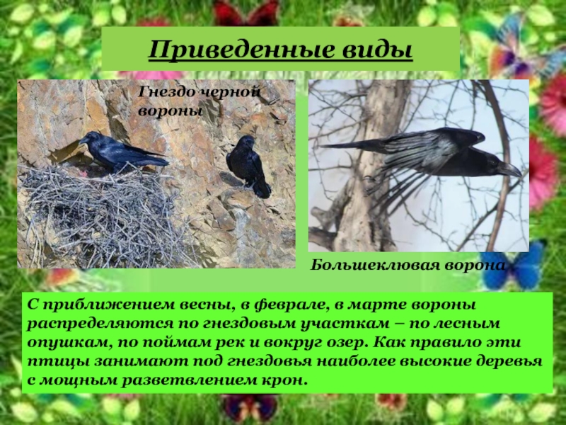 марте вороны распределяются по гнездовым участкам – по лесным опушкам, по поймам рек и вокруг озер. Как правило эти птицы занимают под гнездовья наиболее высокие деревья с мощным разветвлением крон.