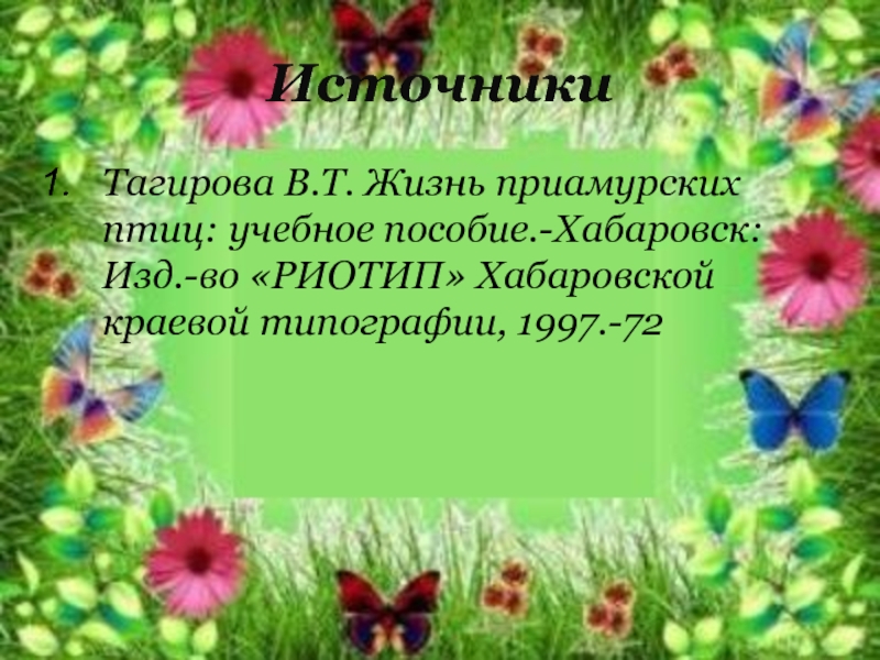 Тагирова В.Т. Жизнь приамурских птиц: учебное пособие.-Хабаровск: Изд.-во «РИОТИП» Хабаровской