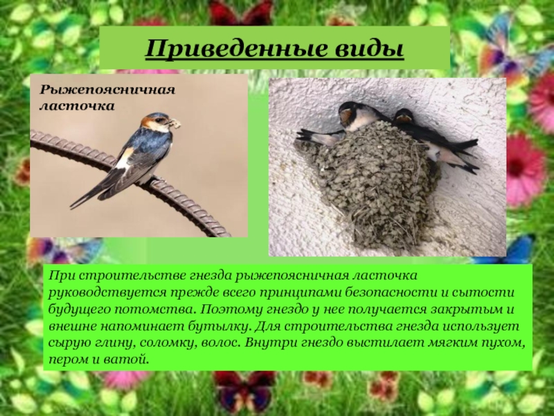 При строительстве гнезда рыжепоясничная ласточка руководствуется прежде всего принципами