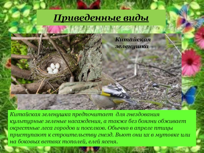 Китайская зеленушка предпочитает для гнездования культурные зеленые насаждения, а