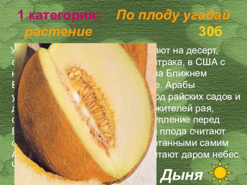 У нас плоды этого растения подают на десерт, англичане едят его во время завтрака, в США с него нередко начинают обед, а на Ближнем Востоке их подают к мясу и рыбе. Арабы утверждают , что плод этот – плод райских садов и доставил его на Землю один из жителей рая, совершив этим страшное преступление перед Богом. Трещины на поверхности плода считают священными письменами, начертанными самим Аллахом. Поэтому плод этот считают даром небес. Что это за плод?