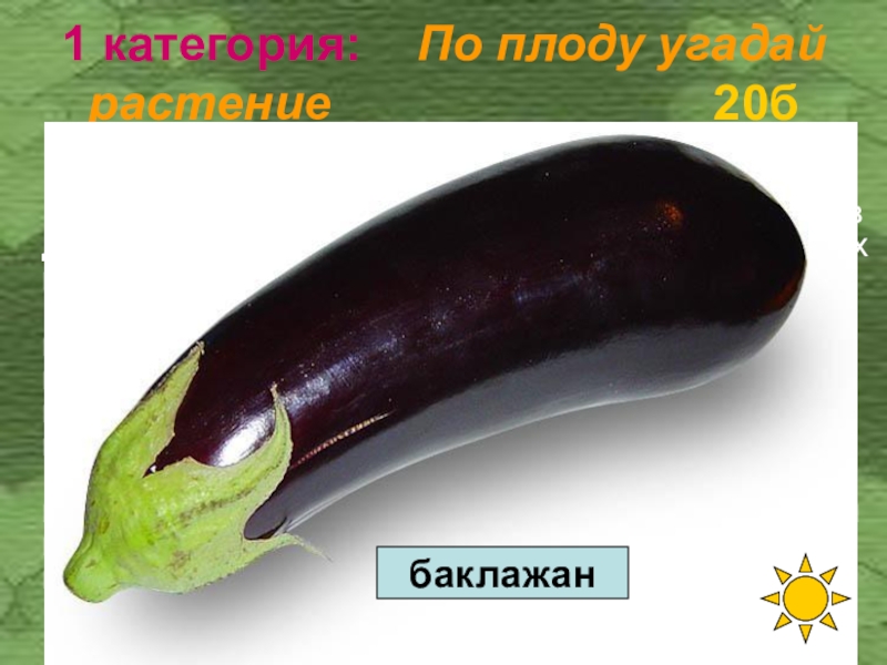 Большая ягода округлой, грушевидной или цилиндрической формы; поверхность плода матовая или глянцевая. Достигает в длину 70 см, в диаметре — 20 см; весит 0,4—1 кг. Окраска спелых плодов — от серо-зелёной до буровато-жёлтой. При полном созревании они становятся грубыми и невкусными, поэтому в пищу их используют немного недозревшими. Эти плоды активно используются в кулинарии многих стран мира. Их варят, жарят, запекают, тушат, готовят на гриле, маринуют, используют для приготовления салатов и икры, а также едят сырыми. Перезревшие плоды не рекомендуется употреблять в пищу, так как в них содержится много соланина.