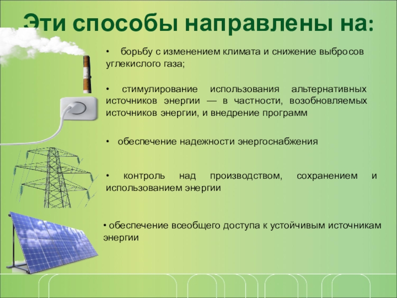 • стимулирование использования альтернативных источников энергии — в частности, возобновляемых источников энергии, и внедрение программ