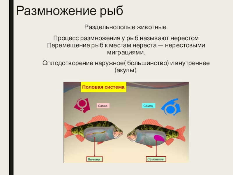 Размножение рыбРаздельнополые животные. Процесс размножения у рыб называют нерестом Перемещение рыб к местам нереста — нерестовыми миграциями.Оплодотворение