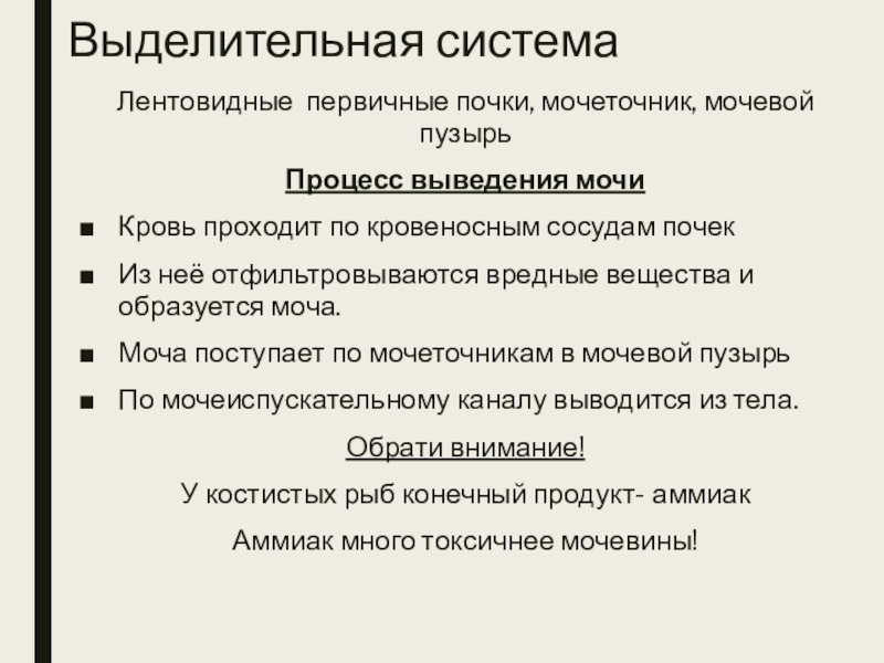 Выделительная система Лентовидные первичные почки, мочеточник, мочевой пузырьПроцесс выведения мочи Кровь проходит по кровеносным сосудам почек Из