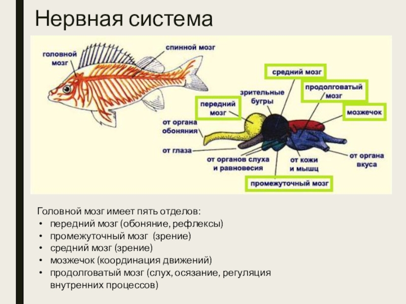 Нервная системаГоловной мозг имеет пять отделов:передний мозг (обоняние, рефлексы)промежуточный мозг (зрение)средний мозг (зрение)мозжечок (координация движений)продолговатый мозг (слух,