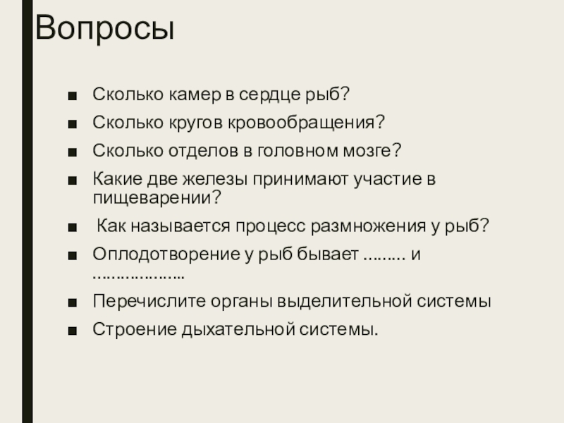 ВопросыСколько камер в сердце рыб?Сколько кругов кровообращения?Сколько отделов в головном мозге?Какие две железы принимают участие в пищеварении?