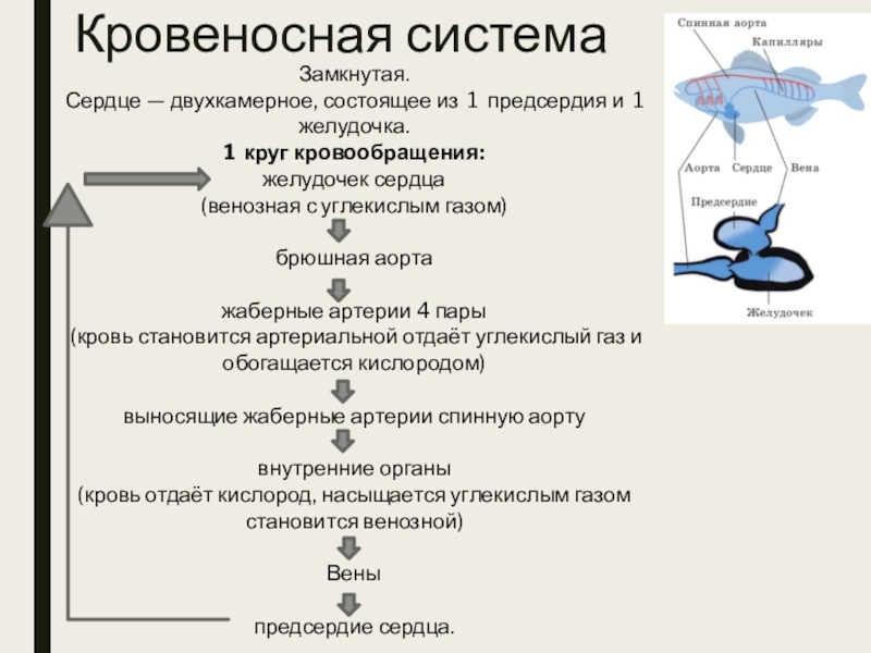 Кровеносная системаЗамкнутая. Сердце — двухкамерное, состоящее из 1 предсердия и 1 желудочка. 1 круг кровообращения:желудочек сердца (венозная