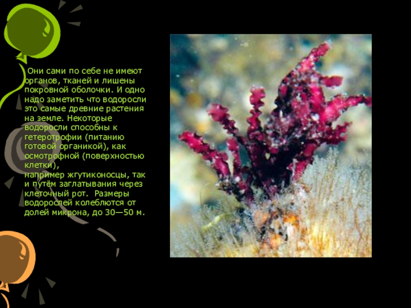 оболочки. И одно надо заметить что водоросли это самые древние растения на земле. Некоторые водоросли способны к гетеротрофии (питанию готовой органикой), как осмотрофной (поверхностью клетки), например жгутиконосцы, так и путём заглатывания через клеточный рот.  Размеры водорослей колеблются от долей микрона, до 30—50 м.