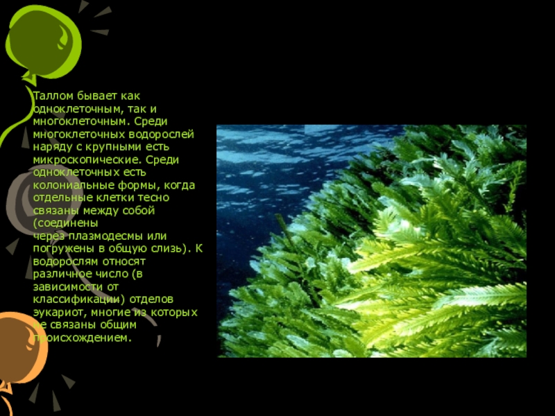 Слайд 4Таллом бывает как одноклеточным, так и многоклеточным. Среди многоклеточных водорослей наряду
