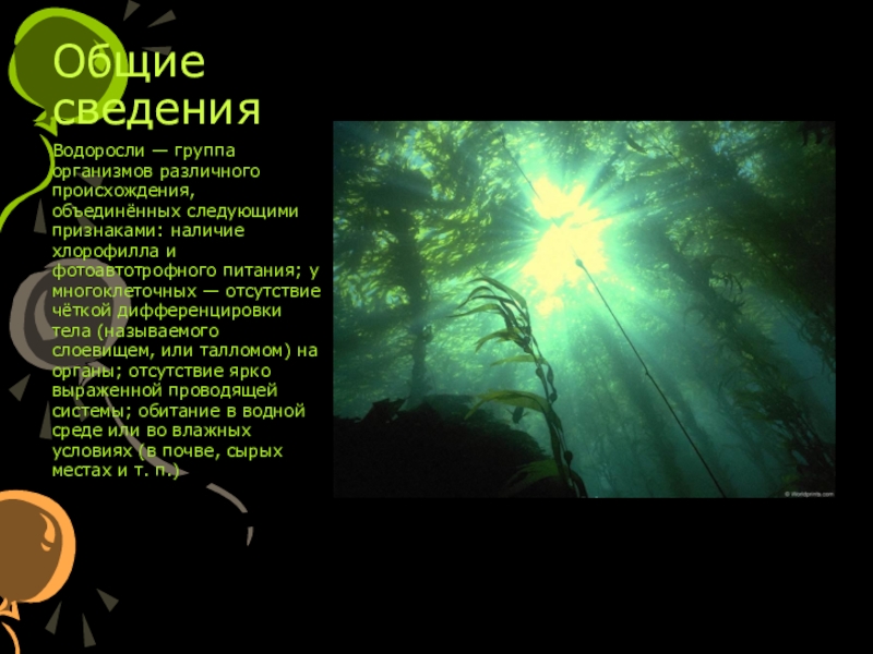 Общие сведенияВодоросли — группа организмов различного происхождения, объединённых следующими признаками: наличие хлорофилла и фотоавтотрофного питания; у многоклеточных — отсутствие чёткой дифференцировки тела (называемого слоевищем, или талломом) на органы; отсутствие ярко выраженной проводящей системы; обитание в водной среде или во