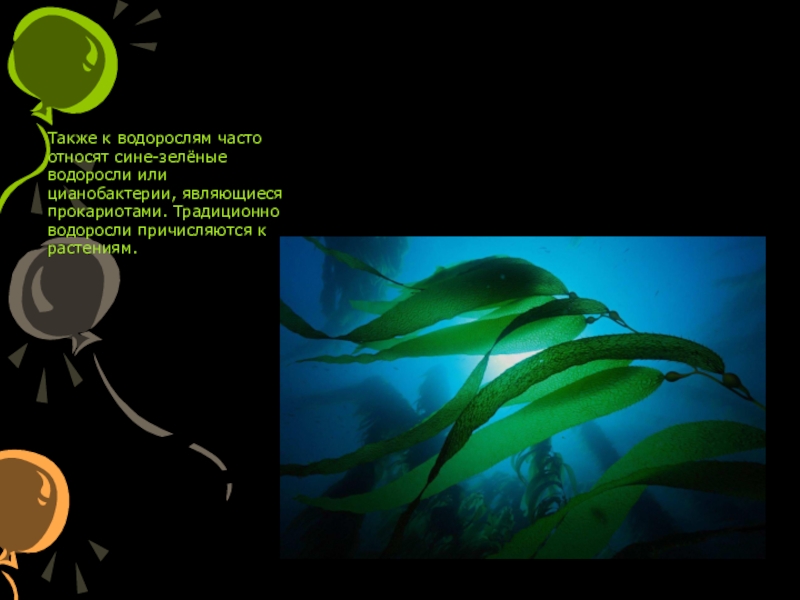 Слайд 5Также к водорослям часто относят сине-зелёные водоросли или цианобактерии, являющиеся прокариотами.
