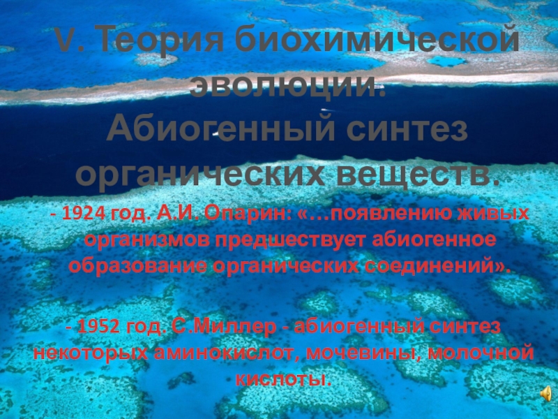 - 1952 год. С.Миллер - абиогенный синтез некоторых аминокислот, мочевины, молочной кислоты.