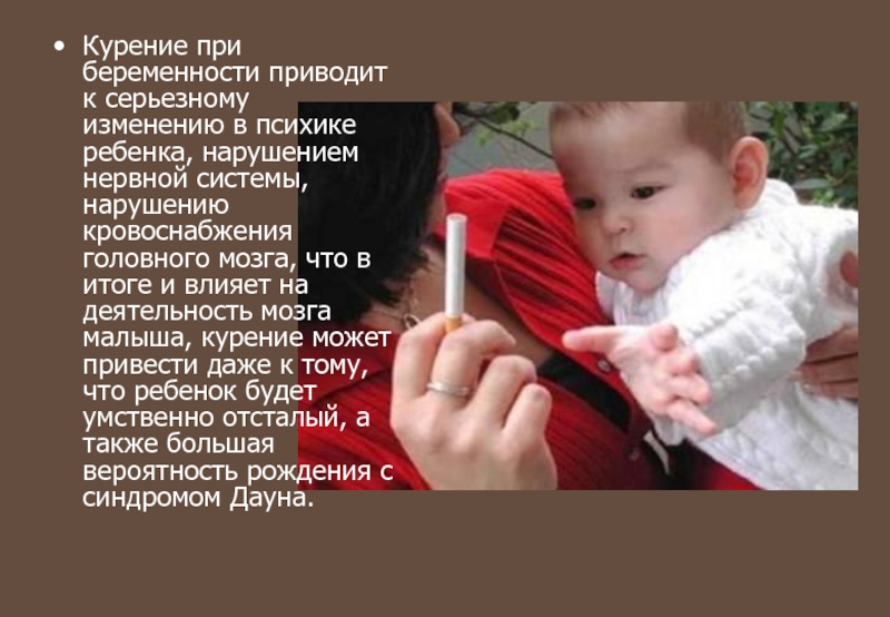 нервной системы, нарушению кровоснабжения головного мозга, что в итоге и влияет на деятельность мозга малыша, курение может привести даже к тому, что ребенок будет умственно отсталый, а также большая вероятность рождения с синдромом Дауна.