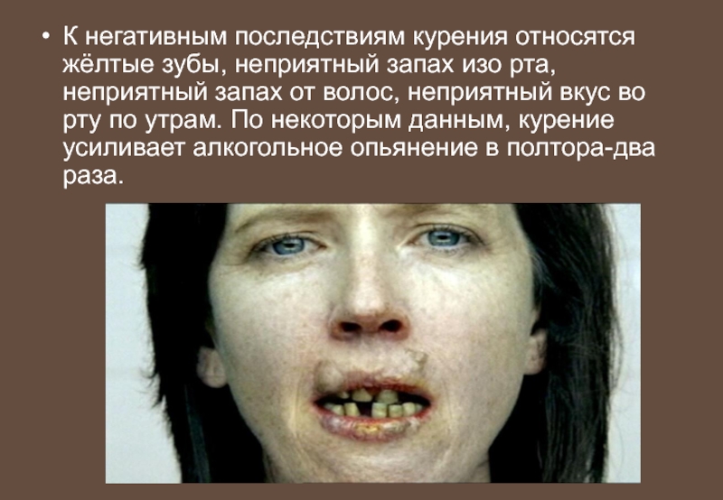 К негативным последствиям курения относятся жёлтые зубы, неприятный запах изо рта,