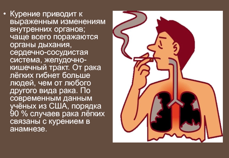 дыхания, сердечно-сосудистая система, желудочно-кишечный тракт. От рака лёгких гибнет больше людей, чем от любого другого вида рака. По современным данным учёных из США, порядка 90 % случаев рака лёгких связаны с курением в анамнезе.