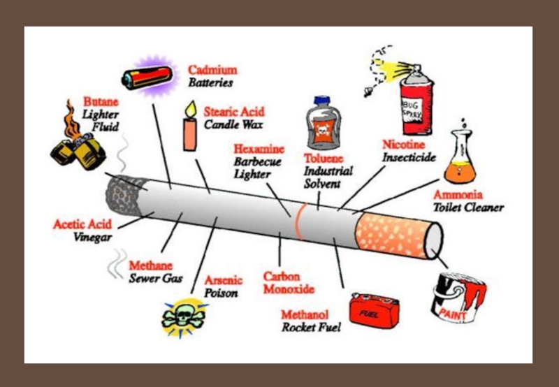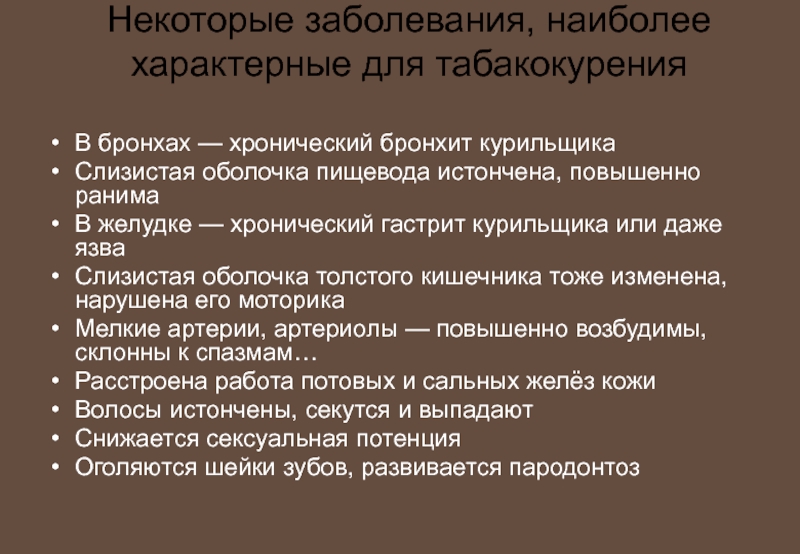 Некоторые заболевания, наиболее характерные для табакокурения В бронхах — хронический бронхит курильщикаСлизистая оболочка пищевода истончена, повышенно ранимаВ желудке