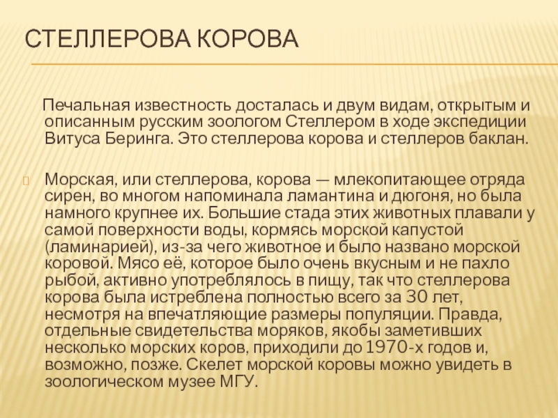 Стеллерова корова    Печальная известность досталась и двум видам, открытым и описанным русским зоологом Стеллером
