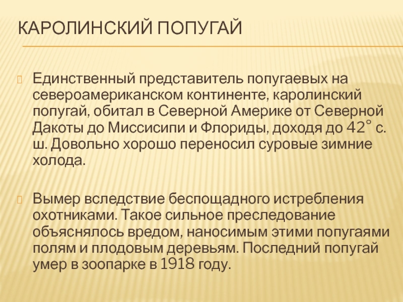 Каролинский попугай Единственный представитель попугаевых на североамериканском континенте, каролинский попугай, обитал в Северной Америке от Северной Дакоты до Миссисипи и Флориды, доходя до 42° с. ш. Довольно хорошо переносил суровые зимние холода.Вымер вследствие беспощадного истребления охотниками.
