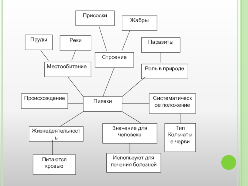 вызова: учитель предлагает попробовать вспомнить учащимся, что они знают о пиявках, а также предлагает подумать над тем, что бы они хотели узнать о пиявках. Учитель предлагает записать все предположения, используя приём «кластеры»