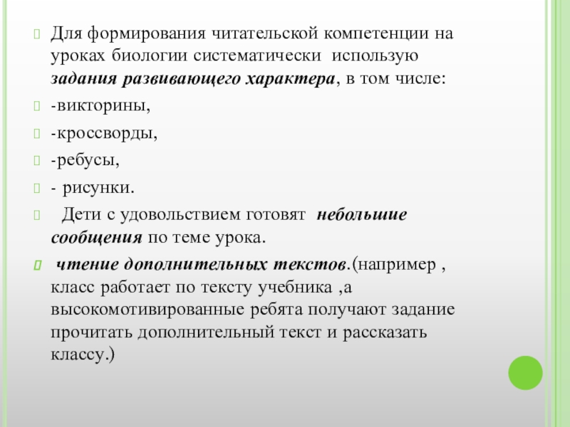 Слайд 4Для формирования читательской компетенции на уроках биологии систематически использую задания развивающего