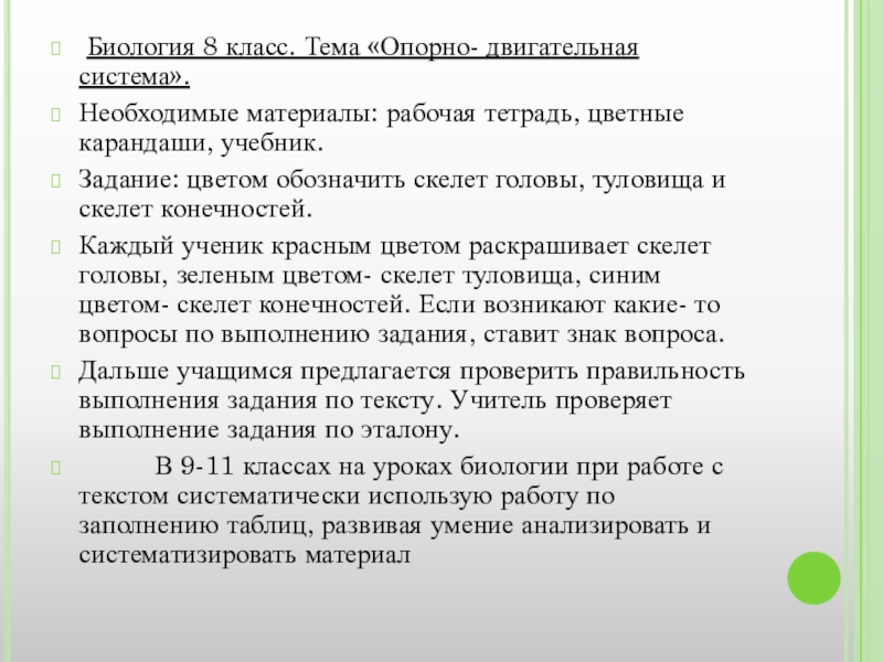 В 9-11 классах на уроках биологии при работе с текстом систематически использую работу по заполнению таблиц, развивая умение анализировать и систематизировать материал