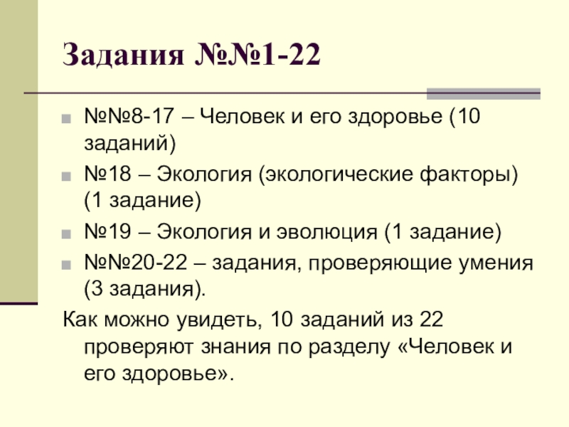 Как можно увидеть, 10 заданий из 22 проверяют знания по разделу «Человек и его здоровье».