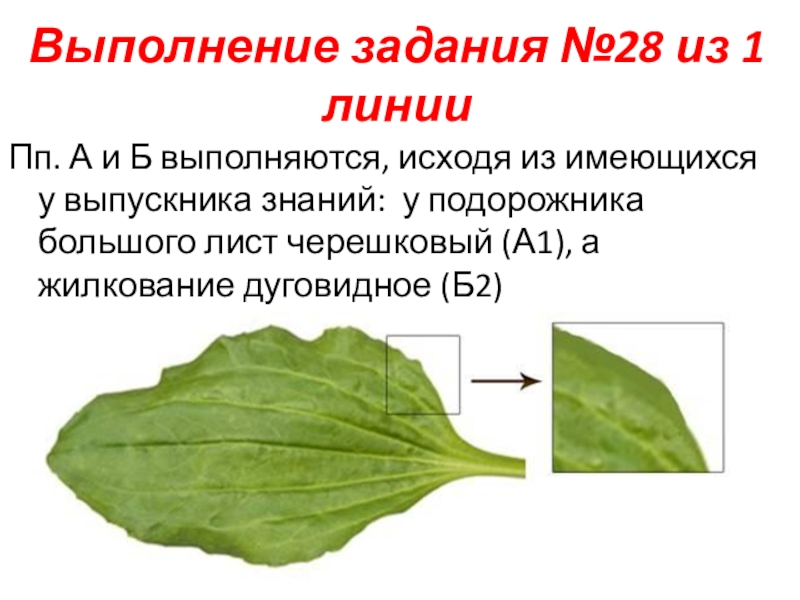 из имеющихся у выпускника знаний: у подорожника большого лист черешковый (А1), а жилкование дуговидное (Б2)