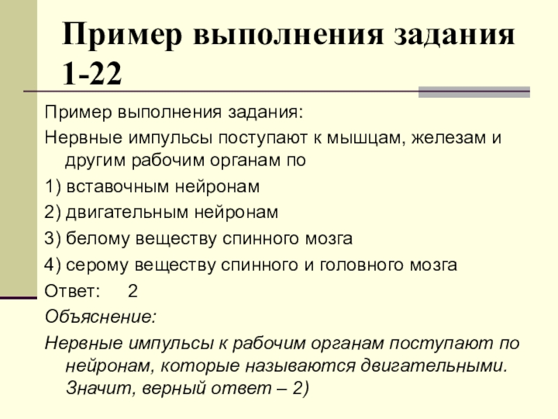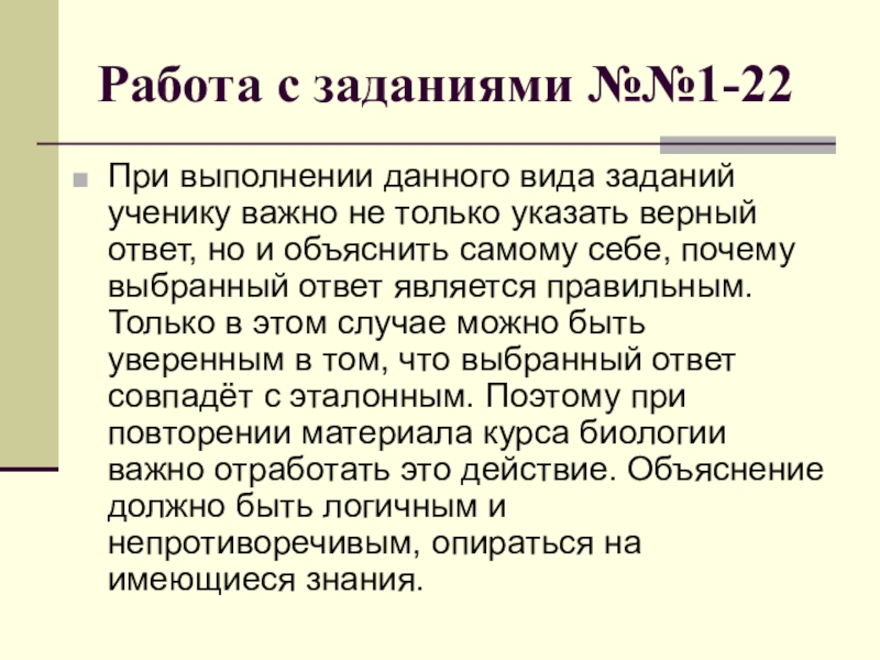 только указать верный ответ, но и объяснить самому себе, почему выбранный ответ является правильным. Только в этом случае можно быть уверенным в том, что выбранный ответ совпадёт с эталонным. Поэтому при повторении материала курса биологии важно отработать это действие. Объяснение должно быть логичным и непротиворечивым, опираться на имеющиеся знания.