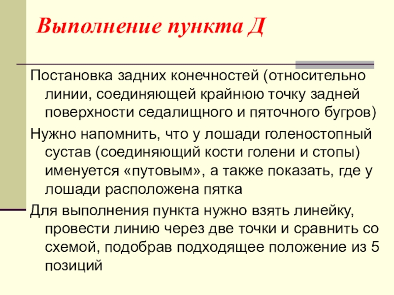 Д. Постановка задних конечностей (относительно линии, соединяющей крайнюю точку задней поверхности седалищного и пяточного бугров) (по схеме из 5 позиций)