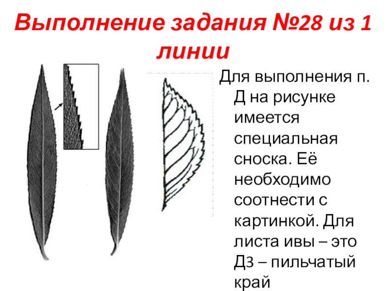 имеется специальная сноска. Её необходимо соотнести с картинкой. Для листа ивы – это Д3 – пильчатый край