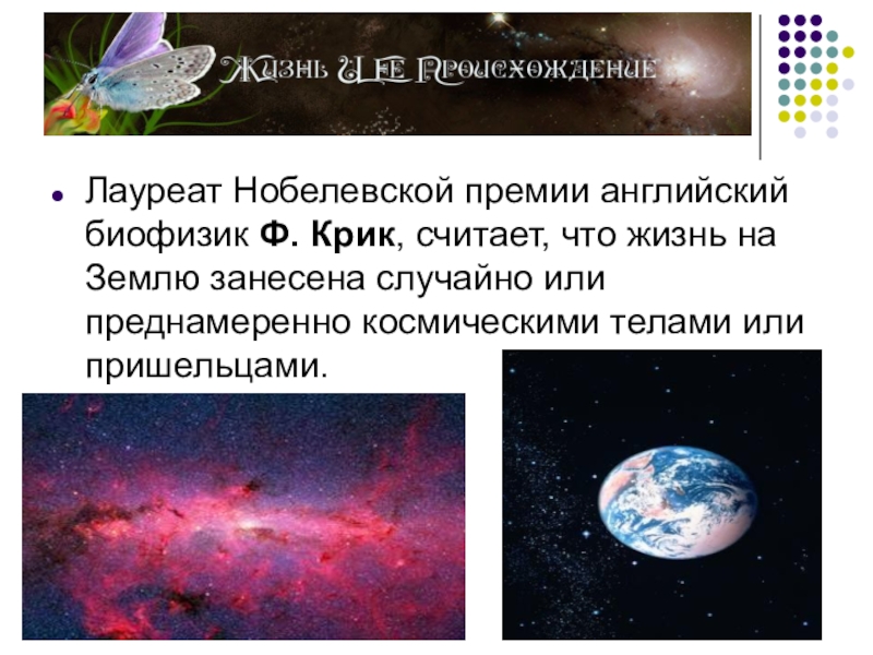 Слайд 22Лауреат Нобелевской премии английский биофизик Ф. Крик, считает, что жизнь на