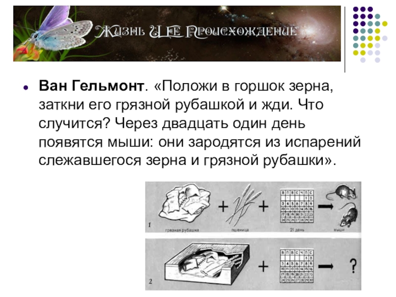 Слайд 2Ван Гельмонт. «Положи в горшок зерна, заткни его грязной рубашкой и