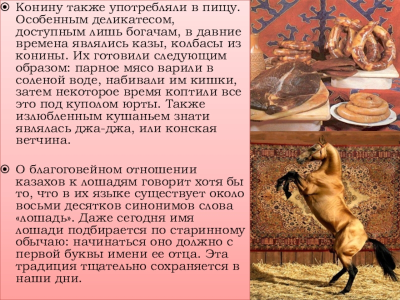Слайд 23Конину также употребляли в пищу. Особенным деликатесом, доступным лишь богачам, в