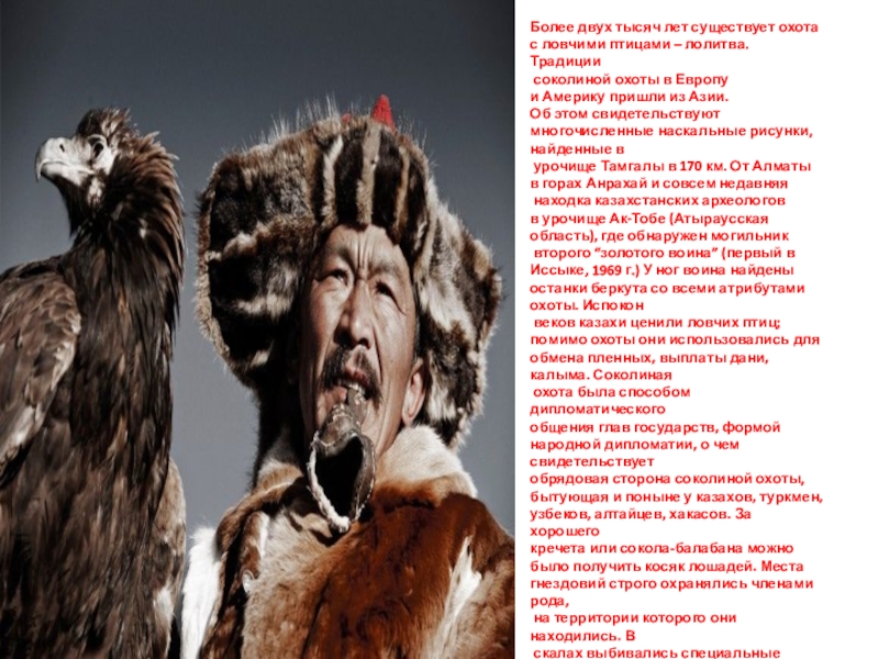 Слайд 14Более двух тысяч лет существует охота с ловчими птицами – лолитва.